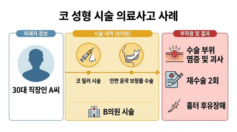 그런데 시술 2주 후 코 주변으로 심한 염증이 시작됐고, 한 달 뒤 필러 주입 부위 조직 괴사로 응급 제거 수술을 받아야 했습니다. 이후 재건 수술까지 총 2회, 치료 기간만 8개월. A씨의 얼굴에는 지금도 흉터가 남아 있습니다.