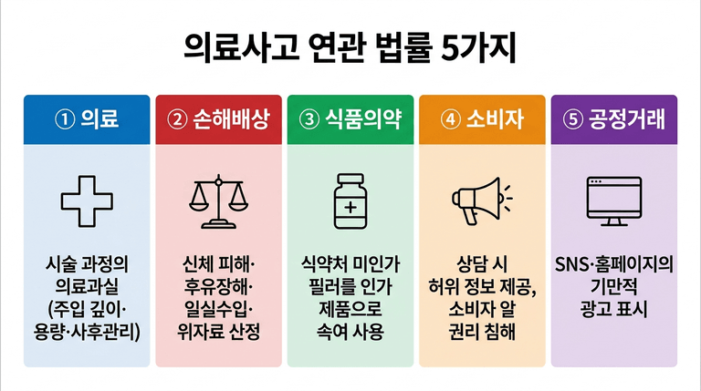 성형 의료사고는 단순히 "시술이 잘못됐다"만으로는 충분한 배상을 받기 어렵습니다. 사용된 재료의 적법성, 상담 과정의 기만 여부, 광고의 위법성까지 다층적으로 공격해야 비로소 병원이 테이블에 앉습니다.