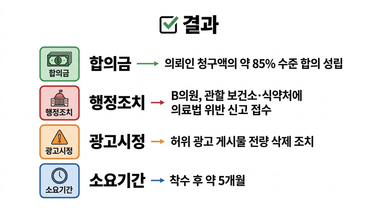 이 사건에서는 식약처 인허가 실사, 공정거래 소비자 규제 분석, 의료 감정 설계, 손해액 산정까지 5개 법률 영역을 하나의 전략으로 통합한 것이 조기 합의의 핵심이었습니다.