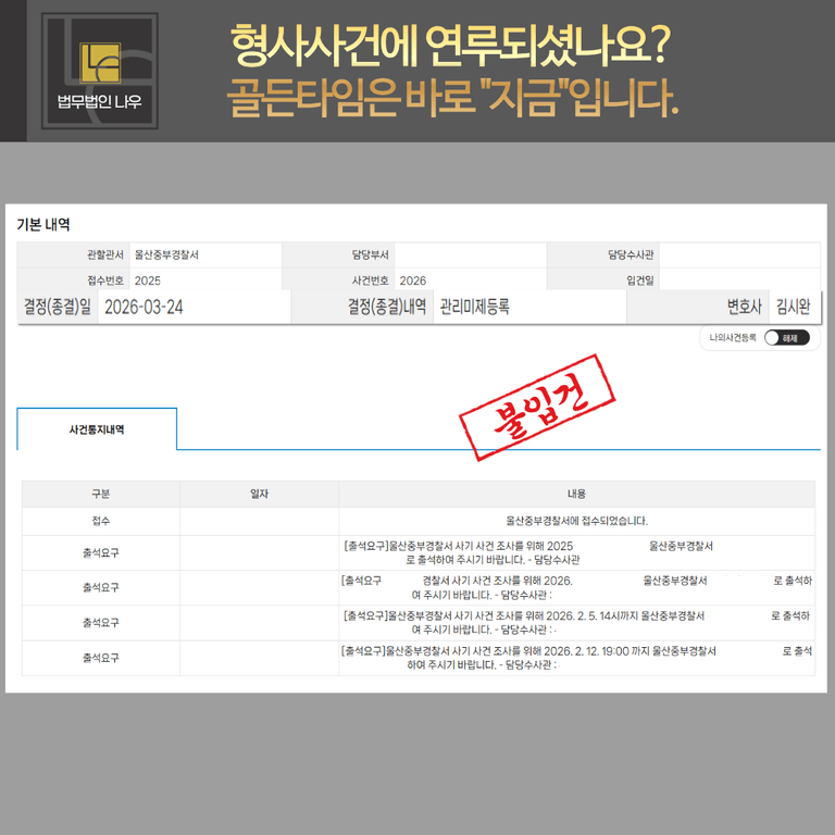 이후 경찰로부터 출석요구까지 받게 되자, 불안감을 느낀 의뢰인은 대응을 위해 울산형사전문변호사 법무법인 나우를 방문해주셨습니다.