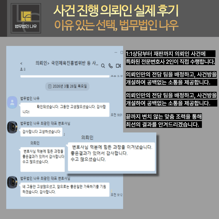 수사관과 소통하여 예정된 조사 일정을 연기하고 의뢰인의 혐의와 신분을 확인한 즉시 국민체육진흥법 위반 혐의가 아닌, 사기범죄에 초점을 두고 참고인 신분이 피의자로 전환되지 않도록 불입건 결정을 통해 사건을 종결할 것을 목표로 사건을 진행하였습니다.