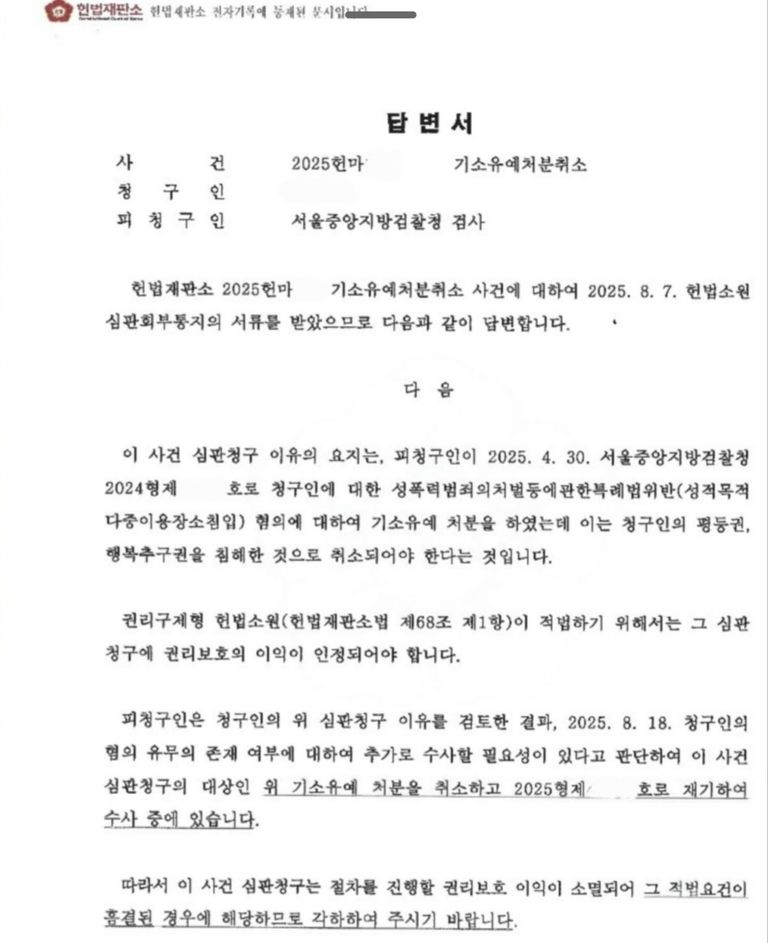 헌법소원을 제기하였는데 답변서 내용이 기소유예 처분을 취소했고 재기하였다는 것이었습니다. 팔은 안으로 굽는 법이라서 이런 상황은 전혀 예상하지 못하였는데 기존 처분이 오죽했으면 이렇게 처리했나 싶은 생각도 들었습니다. 결과적으로 혐의없음 불기소처분을 받을 수 있었습니다.