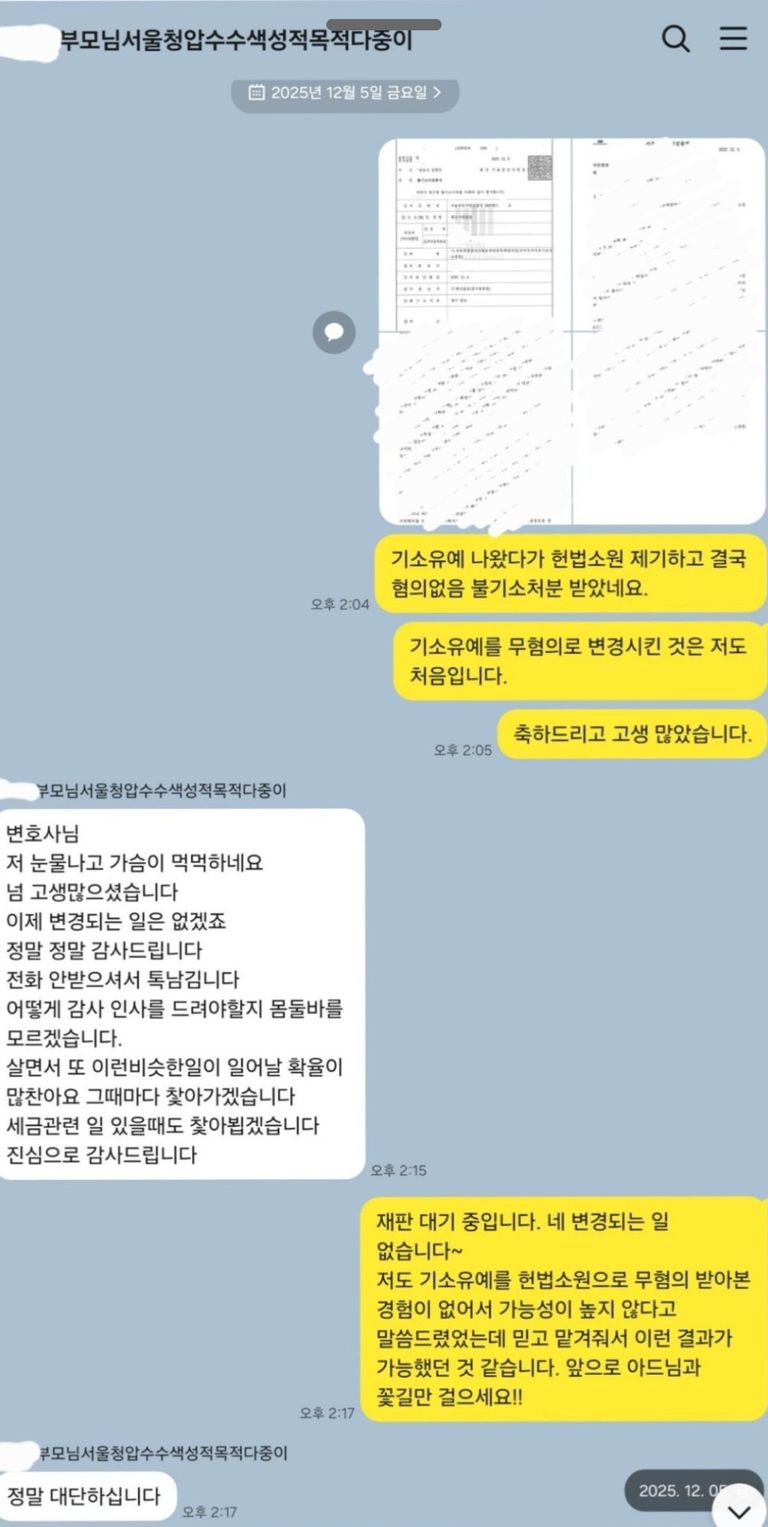 헌법소원이 확률이 낮음에도 불구하고 저를 믿고 맡겨준 의뢰인에게 기쁜 소식을 전달해 줄 수 있어 큰 보람이 있었습니다. 불기소이유서에 나온 판례를 보면 알겠지만 성적목적다중이용장소침입은 허들이 엄청 낮습니다.