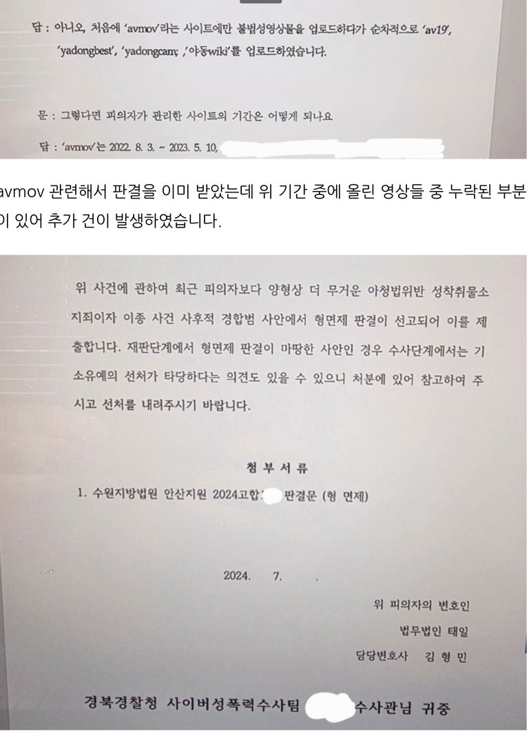 위 기간 중의 업로드에 대해 다툰 것이 아니었는데 모든 영상을 전부 기소한 것이 아니었습니다. 이유는 기소를 하려면 모든 영상이 확보가 되어야 하고 모든 영상들에 대해 불법촬영물에 해당하는지 확인이 되어야 하기 때문에 하나도 빠짐없이 모든 영상을 포함하지 않는, 이런 방식의 처리는 흔히 있습니다. 그런데 이후 불법촬영물의 피해자 중 한 명이 고소를 하였고 해당 기간에 피해자의 영상이 있어서 추가 피의 사건으로 조사가 이루어진 사연이 있었습니다. 의뢰인 입장에서는 억울한 점이 있어 조사입회를 하면서도 수사관분에게 의견을 구두로 전달하였고 이후 의견서도 수차례 제출하였습니다. 기소 의견으로 송치되었다가 검찰에서 보완이 내려왔고 결국 혐의없음 불송치결정이 내려졌습니다.