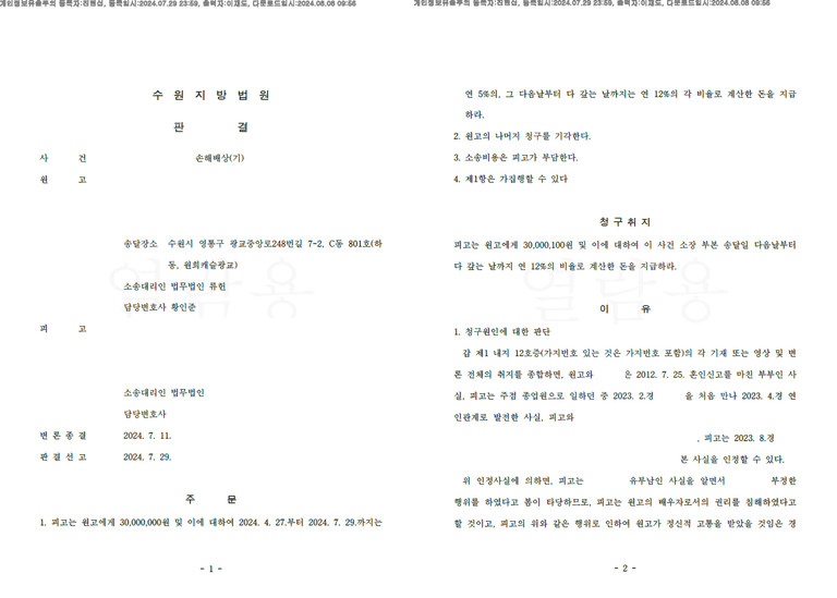그 결과, 재판부는 변호사의 주장을 전면적으로 받아들여 상대방의 책임을 인정하였고, 의뢰인이 청구한 위자료 3,000만 원 전액을 인용하는 판결을 선고하였습니다. 이는 간접 증거와 정황을 유기적으로 결합하여 상대방의 고의 및 책임을 효과적으로 입증한 사례라는 점에서 의의가 있습니다.
