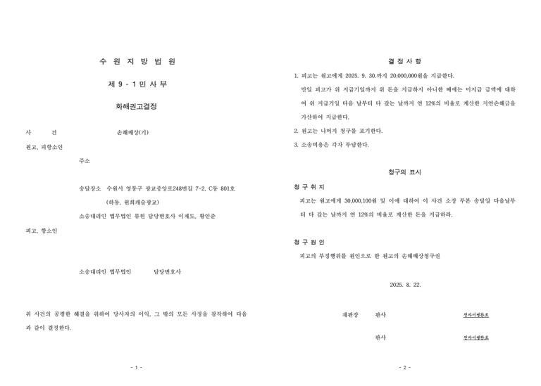 비록 제출된 입증자료가 충분하다고 보기 어려운 측면이 있었으나, 변호사는 상대방 주장에 대한 논리적인 반박과 사건 전반의 경위를 종합적으로 강조함으로써 재판부를 설득하였습니다. 그 결과, 단순한 감액이 아닌 보다 유리한 조건의 화해권고결정을 도출하였고, 의뢰인이 이를 수용함으로써 사건은 안정적으로 마무리되었습니다.