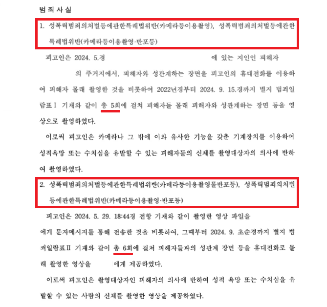 A씨는 2022년경부터 2024. 9. 15.경까지 여성 B, C, D, E, F 등 총 5명과 각 성관계를 하면서 몰래 동영상 촬영하였고(카메라등이용촬영), 2024. 5. 19.경부터 2024. 9.경까지 위 동영상들을 지인 G씨에게 전송하였습니다(카메라등이용촬영물반포등).