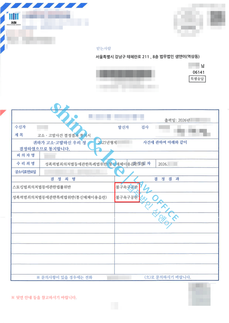 또한 잠정조치의 경우 기한일을 체크하여 때마다 연장 신청하여 의뢰인이 추가적인 스토킹 피해로부터 보호받을 수 있도록 조치하고, 가해자가 반성 없이 추가적인 가해를 이어가고 있는 점 등을 담은 변호사 의견서를 함께 제출하여 수사기관이 가해자의 지속적인 위험성과 재범 가능성을 충분히 인식할 수 있도록 조력하였습니다.