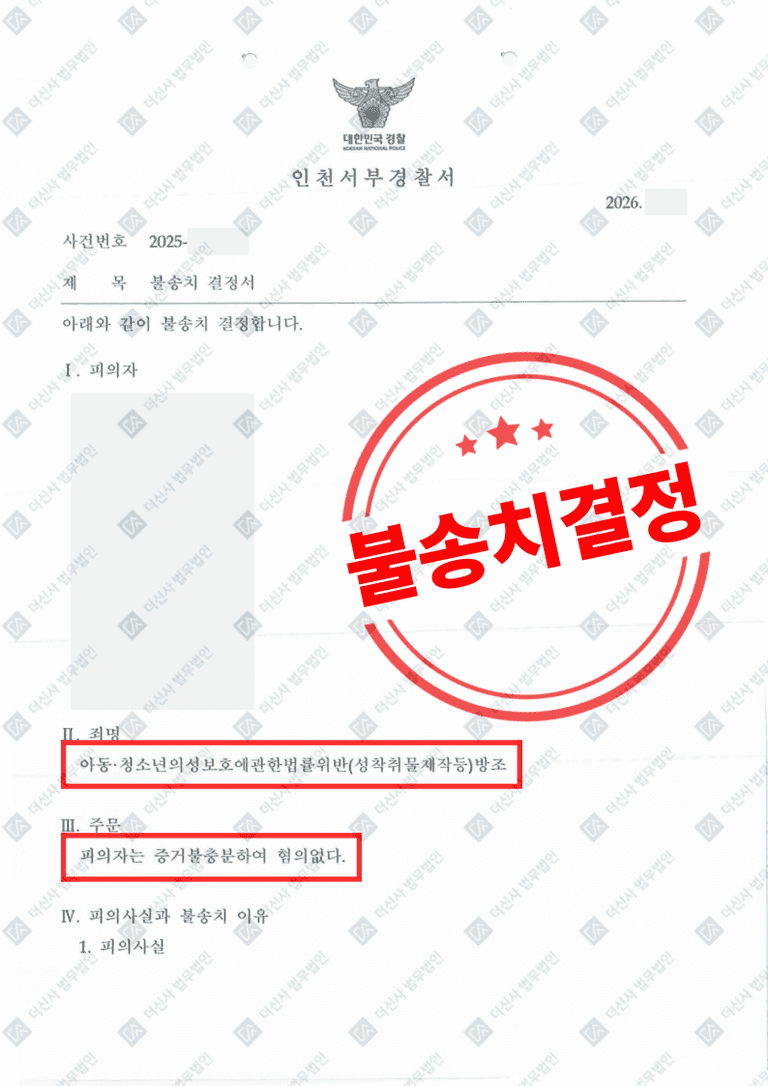 수사기관은 법무법인이 제출한 의견서와 증거자료를 검토하여, 의뢰인에게 범죄 방조의 고의를 인정할 증거가 없다고 판단했습니다. 결국 의뢰인은 '불송치(혐의없음)' 결정을 받아 소중한 교사의 꿈을 계속 이어갈 수 있게 되었습니다.