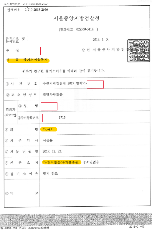 혐의 : 사기 → 결과 : ‘혐의없음(불기소처분)’