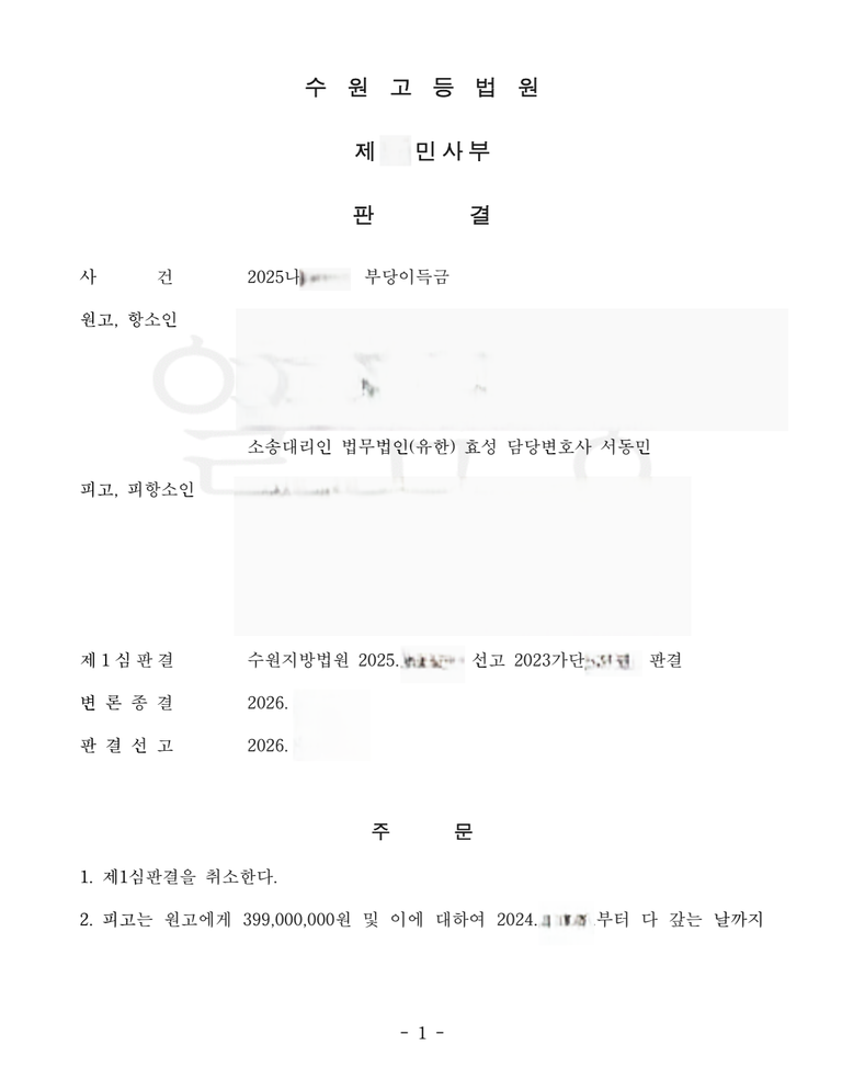 저는 즉각 입금 받은 자를 피고로 하여 민사소송 부당이득반환청구소송을 제기하였고 법원은 원고 승소 판결을 선고하여 의뢰인은 피해액을 반환받았습니다.