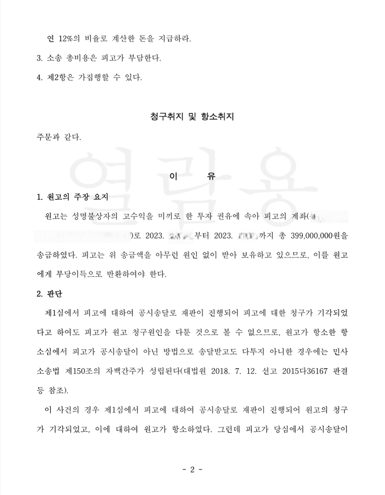 이 사건에서도 의뢰인은 투자사기를 당하여 피고에게 피해액을 입금하였고 이를 돌려받기 위해 저를 찾아오셨습니다.