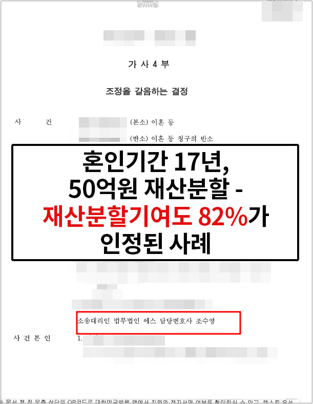 혼인기간 17년, 50억원 재산분할 - 재산분할기여도 82%가 인정된 사례