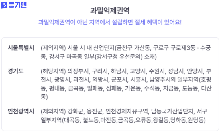 법인설립 초기 회사나 비용에 민감한 중소기업이라면 더 중요합니다. 본점이전 검토 단계에서 이전 전·후 주소가 과밀억제권역에 해당하는지는 꼭 한 번 확인하시기 바랍니다.