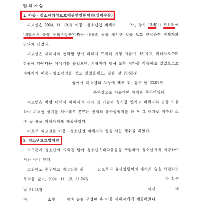 A씨는 2024. 11. 19.경 트위터에서 B양이 나이를 의미하는 숫자 '15'를 포함한 계정으로 "대딸쳐서 술댈 구해주실분"이라는 글을 게시한 것을 보고 B양에게 연락하여 이른바 '술댈구'로 조건만남을 약속하고는 B양을 만나 차에 태워 인근 주차장으로 이동한 다음 B양으로 하여금 유사성행위를 하게 하고 그 대가로 청하, 소주, 맥주 등을 제공하였습니다.