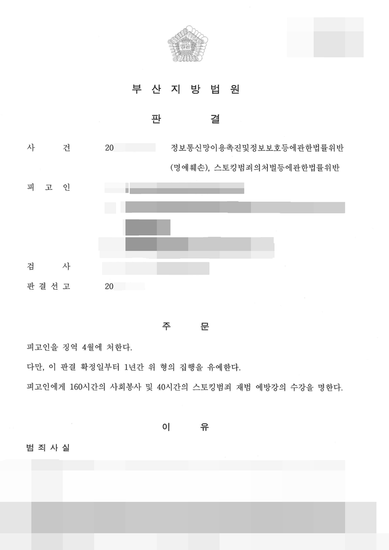 3. 🎉 법원의 판결: 명예훼손·스토킹 유죄, '징역 4월(집행유예 1년)' 선고