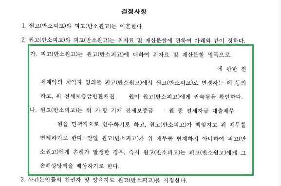 본 건도 화해권고결정의 형식을 띤 조정으로 이루어진 건으로, 원고와 자녀들이 살고 있는 집의 전세계약 명의가 피고로 되어 있다는 점에서 반드시 조정이 필요한 사건이었습니다. 왜냐하면 판결로 선고될 시 전세계약명의는 피고로 그대로인채로 피고가 재산분할 및 위자료명목으로 원고에게 금전을 지급하는 것으로 판결이 날수 밖에는 없기에, 현실적으로는 판결이후 분쟁이 마무리되지 않을 것이 뻔히 보였기 때문입니다.