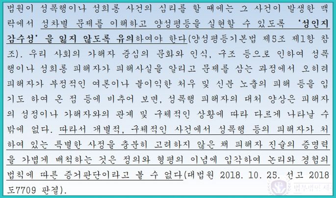 이와 관련하여, 과거에는 '피해자다운 행동'의 유무나 진술의 세부적 모순점을 파고드는 전략이 효과적이었으나, 대법원이 '성인지 감수성'을 성범죄 사건 심리에 고려해야한다는 판결을 한 이후 상황이 급변했습니다. 현재는 피해자가 처한 특별한 사정을 감안하여 진술에 다소 미진한 점이 있더라도 이를 폭넓게 인정하는 추세여서, 과거와 같은 단순한 논리만으로는 무죄를 이끌어내기가 매우 어려워졌습니다.