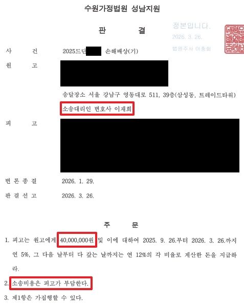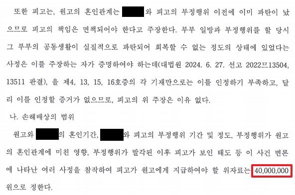 법원은 피고의 상간 행위를 모두 인정하면서 피고에게 위자료 4천만 원의 지급을 명하고 소송비용 전부를 피고가 부담하도록 결정했습니다.