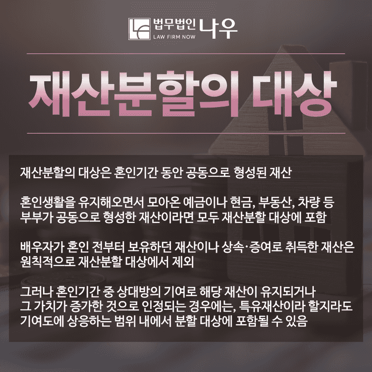 일반적으로 재산 분할의 대상이 되는 재산을 혼인기간 중 공동으로 형성한 재산이라고 할 수 있습니다.