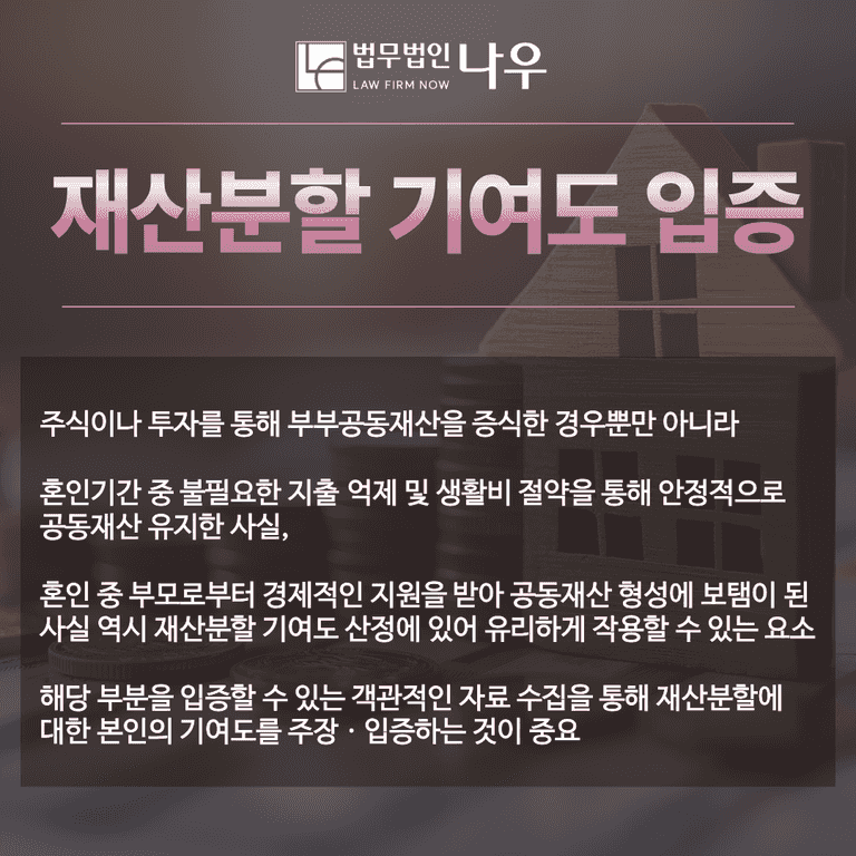 기여도는 재산을 증식하는 것에 그치지 않고 혼인기간 중 불필요한 지출을 방지하고 절약하여 부부 공동재산을 안정적으로 유지한 경우, 부모님의 경제적 지원을 통해 재산형성에 보탬이 된 경우와 같이 부부공동재산의 유지에 노력한 사실 또한 기여도로 인정될 수 있기에 해당 사실을 입증할 수 있는 객관적인 자료를 미리 수집해 두시는 것을 권고드립니다.