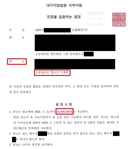 재판부는 사건을 조정에 회부하였으나, 원고가 피고측이 제시한 위자료 1,600만 원 제안을 거부하여 조정은 불성립되었습니다. 그러나 재판부에서 직권으로 위자료 1,600만 원, 소송비용 각자 부담으로 강제조정(조정을 갈음하는 결정)을 하였고, 이후 원고측에서도 2주 내에 이의신청을 하지 않아 그대로 판결이 확정되었습니다.