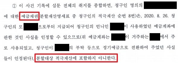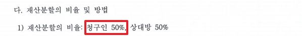 친언니의 차명계좌임을 인정받아 차명계좌에 있던 5천만 원 상당의 예금이 재산분할대상에서 제외되었으며, 청구인의 기여도를 50%로 인정받았습니다(소송 당시 청구인의 재산은 차명계좌에 있던 5천만 원을 제외하면 거의 없고 상대방의 재산만 있던 상황).