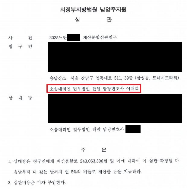 친언니의 차명계좌라는 사실을 인정받기 위해 계좌를 빌려준 경위, 예금 출처, 입출금 장소 등을 적극 주장 및 입증하였고, 기여도를 인정받기 위해 혼인기간, 혼인 당시 재산, 신혼집 등 부동산 형성 경위 및 자금 출처, 가사노동 등을 적극 주장하였습니다.