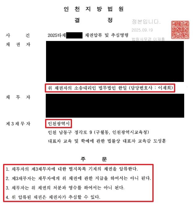 이에 채권자는 남은 과거양육비 채권을 피보전권리로 하여 인천광역시 소속 교사로 일하고 있는 채무자의 급여채권에 대한 압류 및 추심명령을 신청하였습니다.