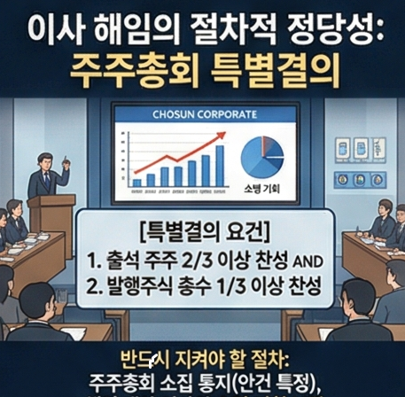 이사 해임은 주주들의 강력한 권한이므로 보통결의보다 까다로운 특별결의를 거쳐야 합니다. 특별결의는 출석한 주주 의결권의 3분의2이상, 발행주식 총수의 3분의1이상의 찬성이 있어야 합니다.