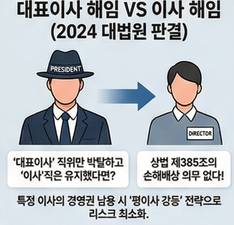 실무상 '이사 해임'과 '대표이사 해임'을 혼동하는 경우가 많습니다. 대표이사는 이사회나 주주총회에서 선임되어 주식회사를 대외적으로 대표하고 업무집행을 총괄하는 자로, 이사회의 '대표'이며, 이사는 이사회의 구성원이라는 점에서 차이가 있습니다. 즉, 모든 대표이사는 이사이지만 모든 이사가 대표이사인 것은 아닙니다.