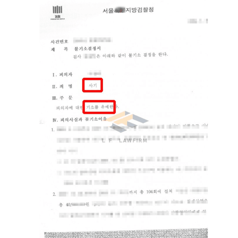 의뢰인은 검찰로부터 사기죄 기소유예 처분을 받을 수 있었습니다.
