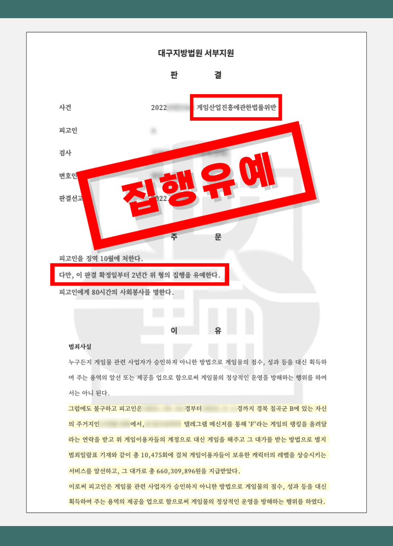 실제 사례 : 대리게임 영업 → 집행유예