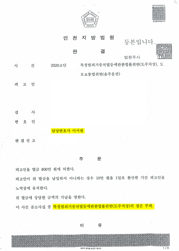 이서원 변호사는 피해자들의 보험사기 가담 정황과 블랙박스 영상의 허점을 정밀하게 분석하여 법원을 설득하였고, 인천지방법원은 특가법 도주치상의 점에 대하여 전부 무죄를 선고하였습니다. 음주운전 부분은 벌금 800만 원으로 마무리되었습니다.