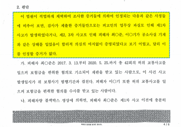 이 사건의 핵심은 피해자들이 주장하는 상해가 실제로 피고인의 과실로 발생하였는지 여부였습니다. 특히 2, 3차 사고에서 피해자들이 주장하는 충격 부위와 진단서에 기재된 상해 부위가 일치하지 않았고, 블랙박스 영상에도 충격 장면이 명확히 확인되지 않았습니다. 나아가 피해자들이 허위 교통사고를 이용한 보험사기 전력이 있다는 점이 중요한 쟁점으로 떠올랐습니다.