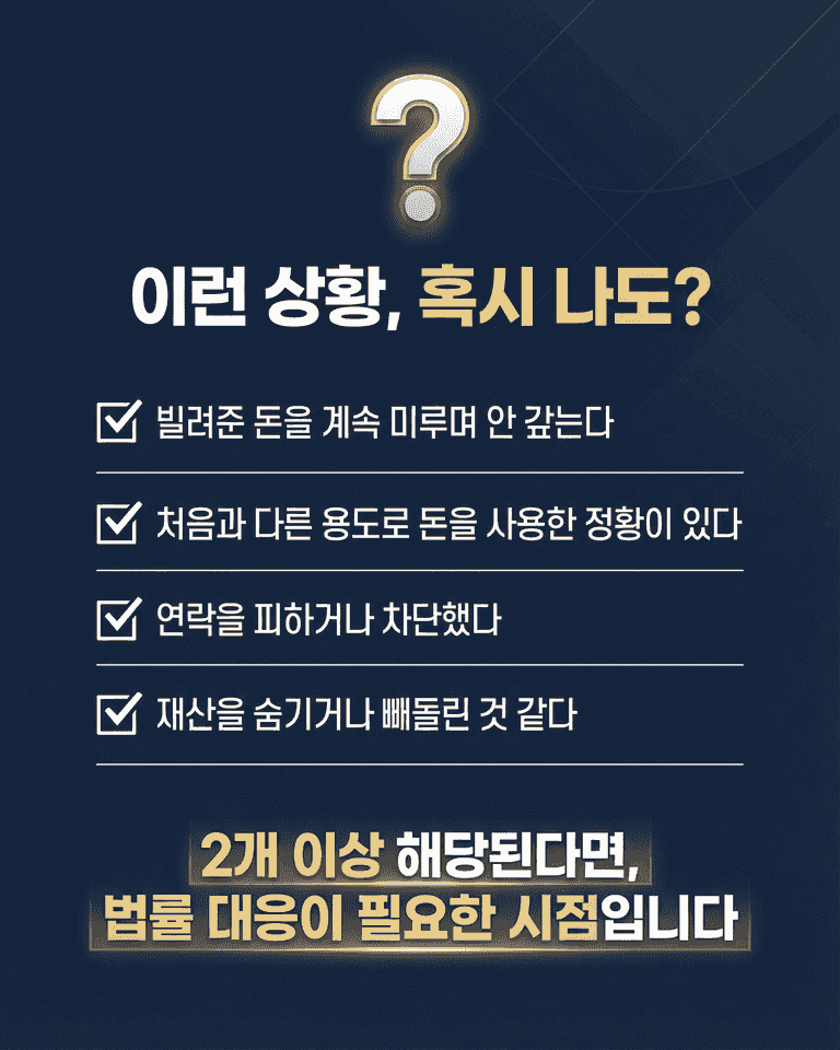 금전 문제는 단순한 돈의 문제가 아닙니다. 관계의 신뢰가 무너지고, 일상의 불안이 시작되며, 혼자서 해결하려 할수록 상황은 더 복잡해집니다.