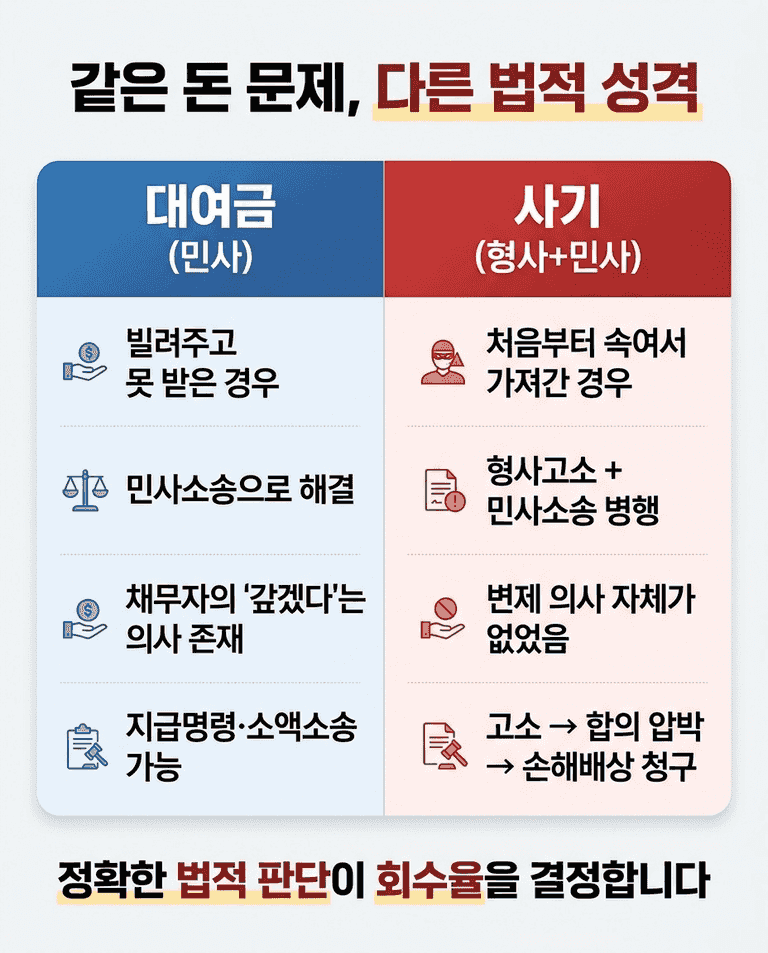 이 지점이 바로 일반인이 혼자서 판단하기 어려운 부분입니다. '단순히 돈을 안 갚는 것'과 '처음부터 속여서 돈을 가져간 것'은 법적으로 완전히 다른 문제이며, 대응 전략도 달라집니다. 사기로 판단되면 형사 고소가 가능해지고, 이는 이후 협상과 회수에 결정적인 지렛대가 됩니다.