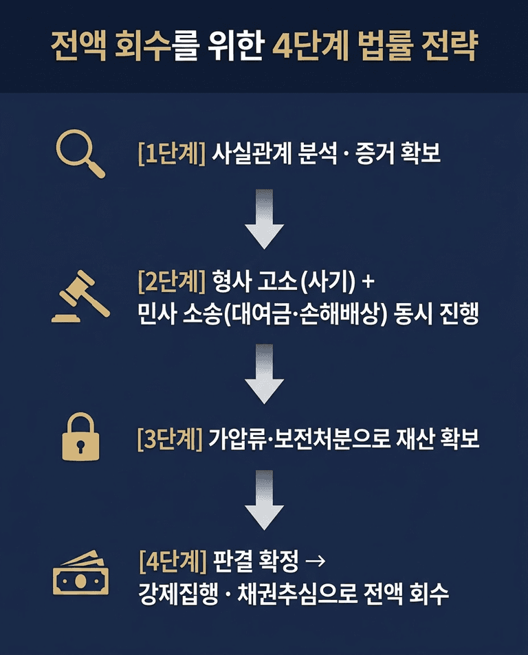 형사 고소는 상대방에게 강한 합의 동기를 부여하기 때문에, 민사 소송만 진행하는 것보다 회수 속도와 가능성을 모두 높이는 효과가 있습니다. 다만 모든 금전 분쟁이 사기에 해당하는 것은 아니므로, 전문가의 판단이 먼저 필요합니다.
