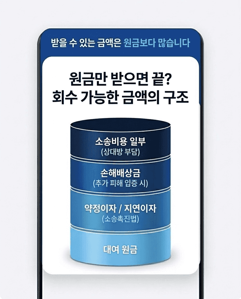 많은 분들이 "빌려준 원금만이라도 받으면 다행"이라고 생각하십니다. 하지만 법률적으로는 원금 외에도 지연이자, 약정이자, 그리고 상대방의 불법행위로 인한 손해배상까지 청구할 수 있습니다.