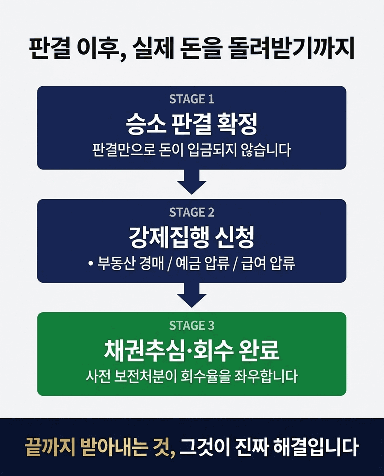 판결문은 '받을 권리가 있다'는 확인서일 뿐, 실제 회수는 강제집행과 채권추심이라는 별도의 절차를 통해 이루어집니다.