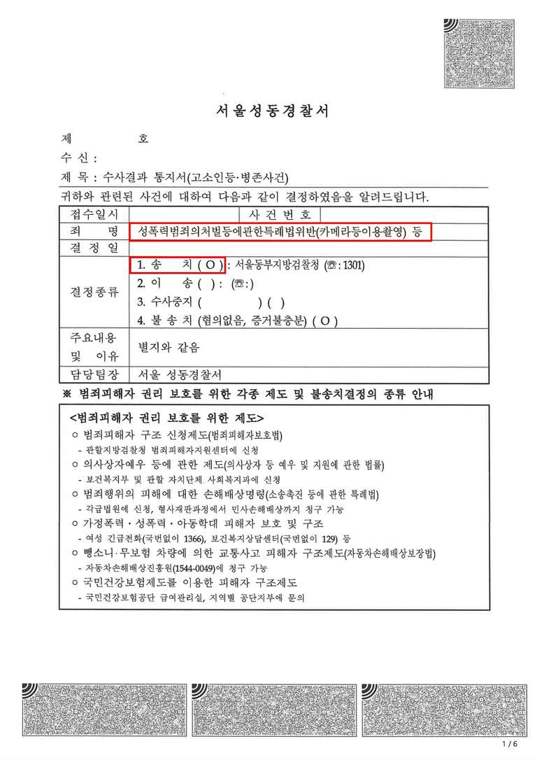 경찰은 위와 같이 수사결과를 통지하였으며, 성폭력범죄의 처벌 등에 관한 특례법 위반(카메라등이용촬영) 중 가-1, 가-2, 가-3항, 재물손괴(다-1, 다-2항), 건조물침입미수, 건조물침입, 특수협박, 폭행 혐의에 대하여 불구속 송치 결정을 내렸습니다. 이로써 피의자는 서울동부지방검찰청에 사건이 송치되어 검찰 수사 및 기소 단계로 나아가게 되었습니다.