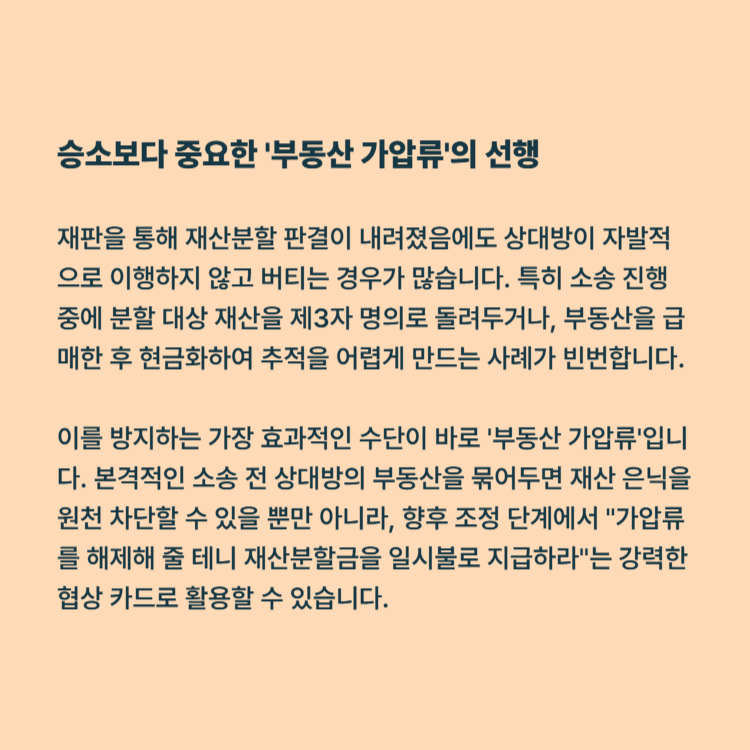 물론 사후에 '사해행위취소소송' 등을 통해 재산을 원상복구 할 수는 있지만, 그 과정에서 소모되는 시간과 비용은 고스란히 의뢰인의 고통이 됩니다. 이를 방지하기 위해 가장 효과적인 수단이 바로 '부동산 가압류'입니다. 본격적인 소송 전 상대방의 부동산을 묶어두면 재산 은닉을 원천 차단할 수 있을 뿐만 아니라, 향후 조정 단계에서 "가압류를 해제해 줄 테니 재산분할금을 일시불로 지급하라"는 강력한 협상 카드로 활용할 수 있습니다.