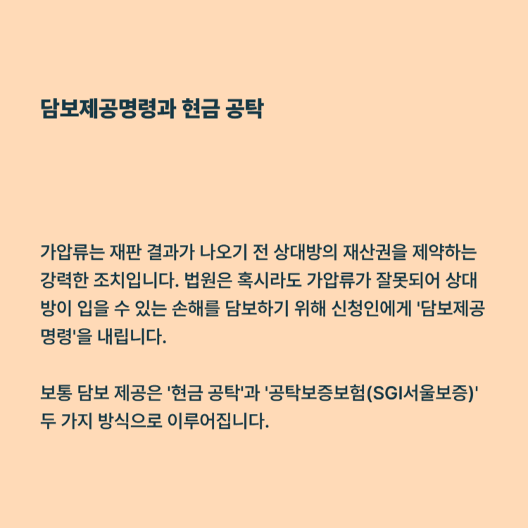 보통 담보 제공은 '현금 공탁'과 '공탁보증보험(SGI서울보증)' 두 가지 방식으로 이루어집니다.