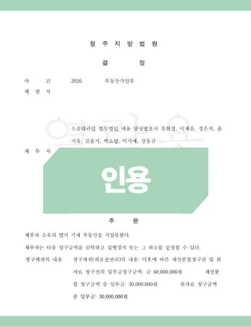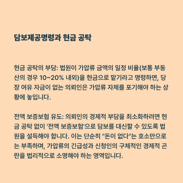 현금 공탁의 부담: 법원이 가압류 금액의 일정 비율(보통 부동산의 경우 10~20% 내외)을 현금으로 맡기라고 명령하면, 당장 여유 자금이 없는 의뢰인은 가압류 자체를 포기해야 하는 상황에 놓입니다.