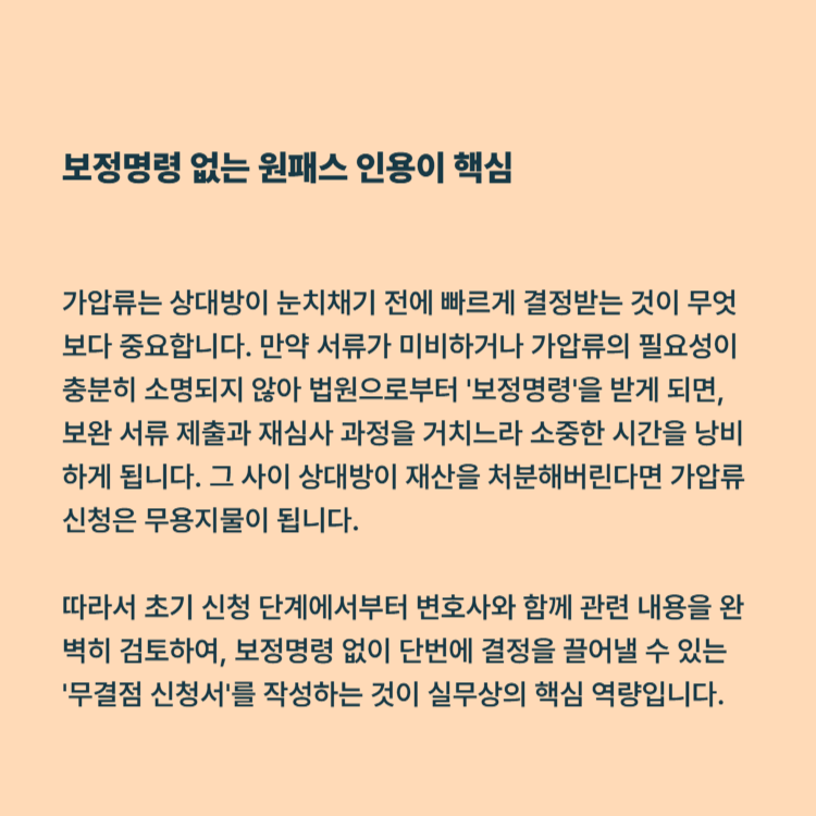 가압류는 상대방이 눈치채기 전에 빠르게 결정받는 것이 무엇보다 중요합니다. 만약 서류가 미비하거나 가압류의 필요성이 충분히 소명되지 않아 법원으로부터 '보정명령'을 받게 되면, 보완 서류 제출과 재심사 과정을 거치느라 소중한 시간을 낭비하게 됩니다. 그 사이 상대방이 재산을 처분해버린다면 가압류 신청은 무용지물이 됩니다.