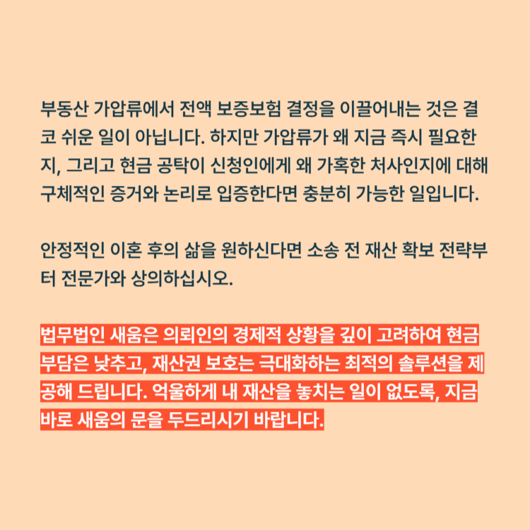 법무법인 새움을 찾은 의뢰인 A씨는 이혼 소송과 동시에 상대방 명의의 부동산에 가압류를 신청하고자 하셨습니다. 하지만 당장 현금 공탁을 할 여력이 부족하여 전액 보증보험 결정이 절실한 상황이었습니다.
