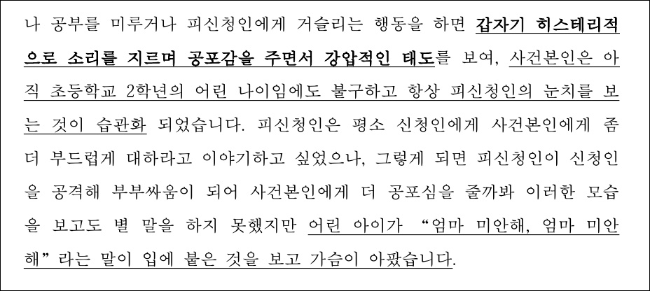 그러나 의뢰인은 실제로 자녀의 주된 양육자로서 지속적으로 양육에 관여해 온 상황이었습니다. 또한 자녀 역시 의뢰인과의 정서적 유대가 깊게 형성되어 있었습니다. 이처럼 실질적인 양육 환경이 의뢰인 중심으로 형성되어 있었던 만큼, 의뢰인은 이혼 이후에도 자녀가 안정적인 환경에서 생활할 수 있도록 양육권을 확보하고자 심지영 법률사무소를 방문하여 상담을 요청하였습니다.