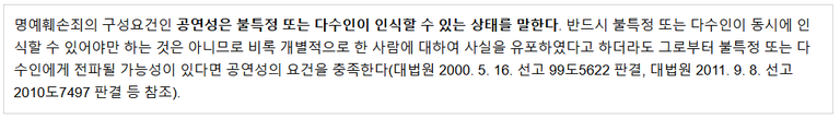 법원의 판단: 단톡방 멤버가 소수(3명)일지라도, 그중 한 명이라도 외부로 내용을 유출할 가능성, 즉 '전파 가능성'이 있다면 법적으로 공연성이 인정됩니다. 특히 해당 사안의 경우 실제로 단톡방에 있던 1인이 대화 내용을 외부로 유출하였다는 점을 들어 전파가능성이 인정되었습니다.