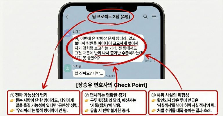 단톡방 사건의 결정적 증거는 '내부 고발자'가 제공한 카카오톡 캡처 화면입니다. 이미 고소가 진행되었다면 감정적 호소 대신 법리적 대응이 필요합니다.