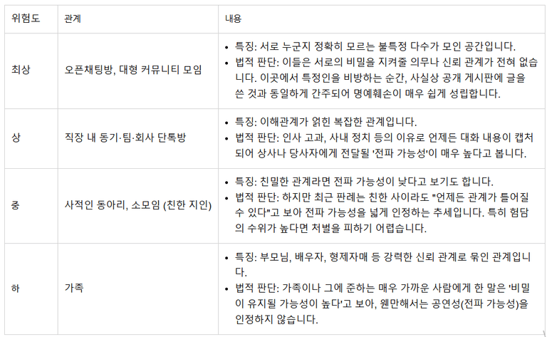 관계의 특수성 입증: 해당 단톡방 멤버들이 '절대 외부에 발설하지 않을 정도로 깊은 신뢰 관계'였음을 입증하는 것이 핵심 변론 포인트가 됩니다. (물론 쉽지 않습니다.)